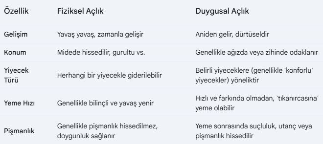 Duygusal açlık, fiziksel açlıktan ziyade duygusal ihtiyaçları gidermek için yemek yemektir. Gerçek açlık midenizden gelen gurultularla yavaş yavaş ortaya çıkar ve herhangi bir yiyecekle giderilebilirken, duygusal açlık aniden ortaya çıkar ve genellikle belirli yiyeceklere (genellikle yüksek şekerli, yağlı veya işlenmiş gıdalar) yöneliktir.